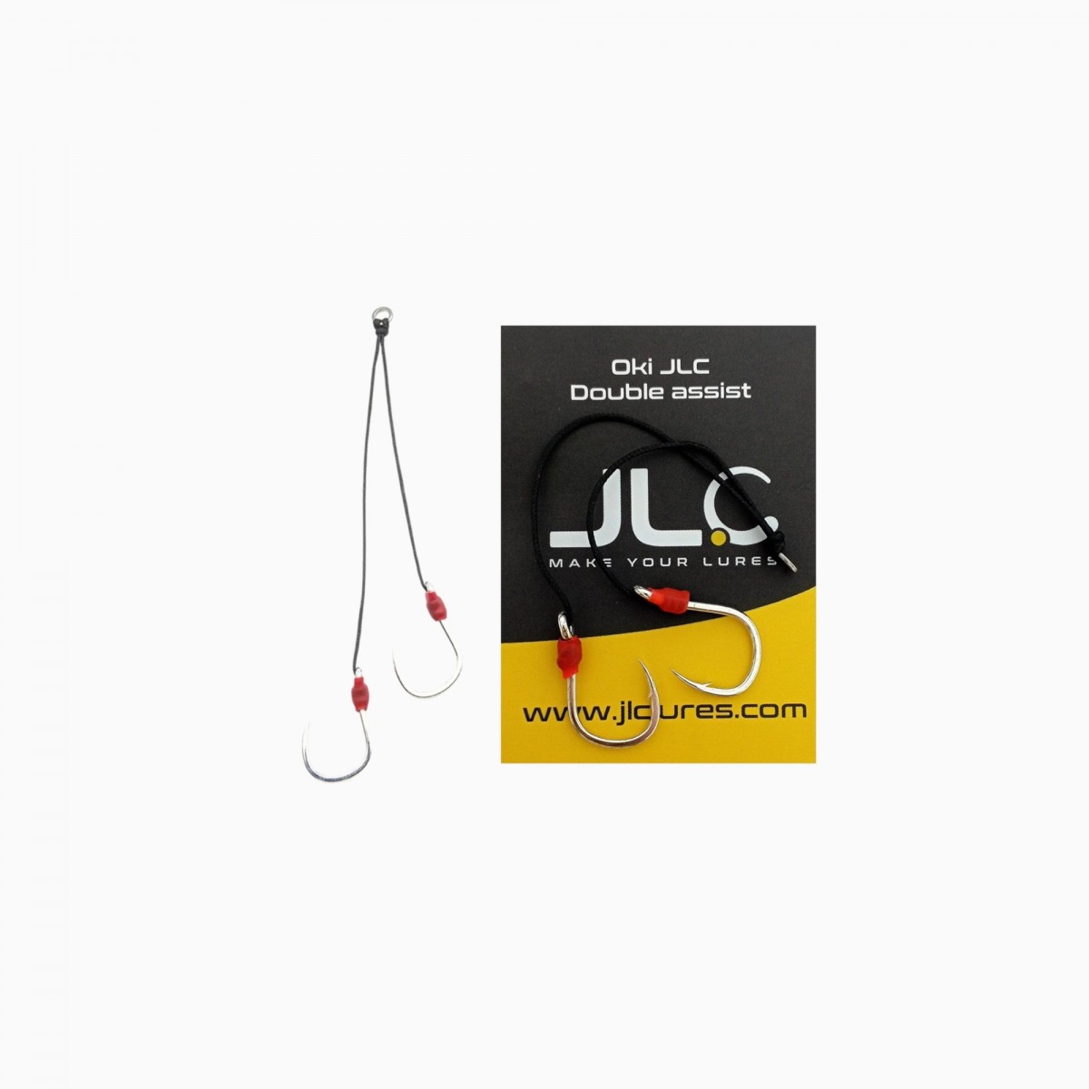 Il rig OKI JLC Double Assist comprende: 1 rig doppio con ami in carbonio BKK 1 3X (ALTO CARBONIO), ricoperti con termoretraibile, treccia rinforzata da 1 mm e un anello in acciaio inossidabile saldato.