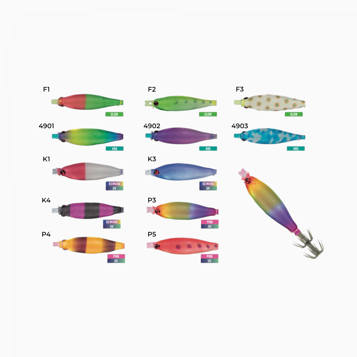 Totanara flessibili speciali TATAKI, 7 cm cestello singolo. Il gelo che costituisce il corpo è galleggiante, cosa che permette un'azione molto rapida sotto l'acqua ed una discesa molto lenta in occasione delle pause dopo l'animazione. I modelli KC hanno un rinforzo trasparente bluastro, ed i modelli PC quanto a loro sono dotati di un rinforzo trasparente divenuto rosa. Venduto alla parte.