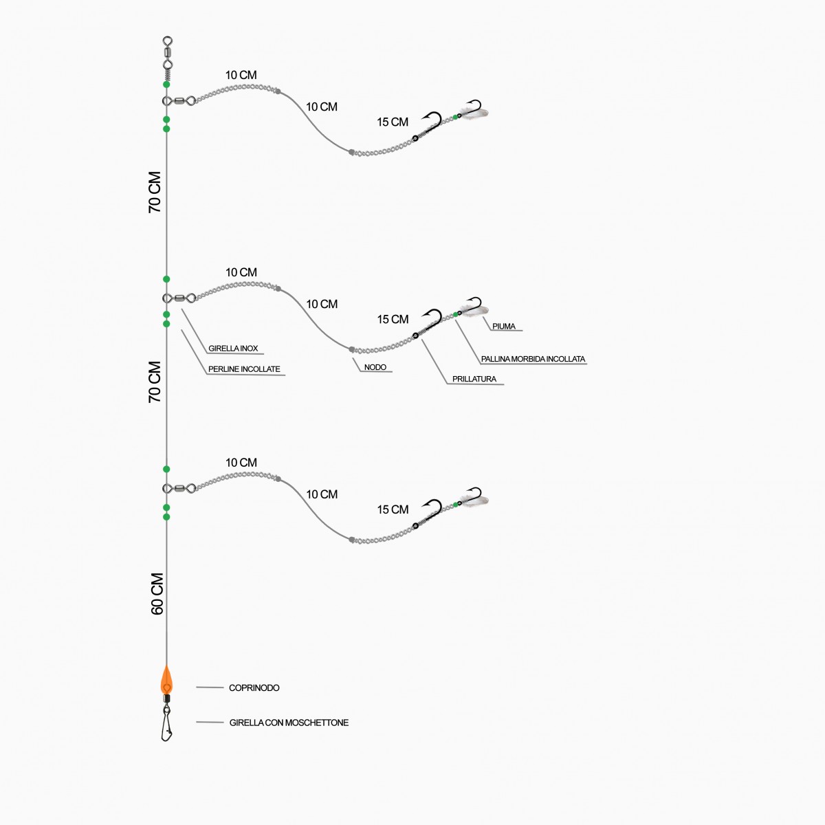 I terminali sono realizzati con Fluorine dello 0.40 mentre gli ami sono inox e sono della misura 2/0 (dove abboccherà il pesce san pietro) mentre l'amo con piuma srà della misura 4 . L'esca ideale per questa tecnica sono piccoli pesci come boghe o piccoli sugherelli. I pesci dovranno essere abbinati al piccolo amo con la piuma, in questa maniera quando il pesce San Pietro mangerà il pesce rimarrà nell'amo più grande.
