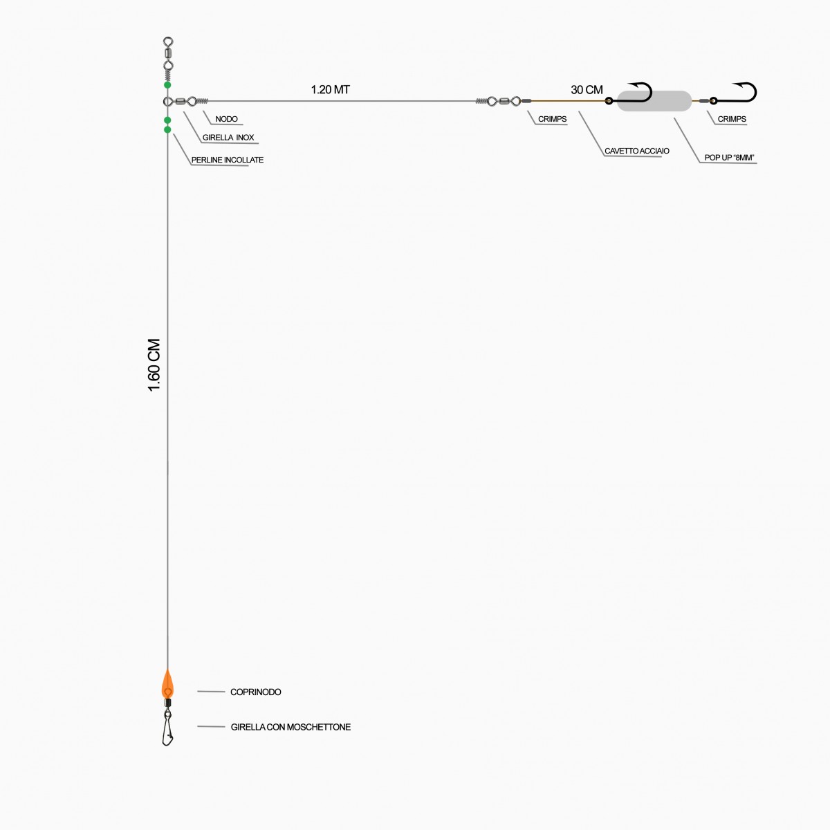 I travi sono disponibili in due versioni : Uno con amo singolo della misura 5/0 , l'altro con amo doppio con amo scorrevole del 3/0 mentre l'amo ferrante è del 5/0.
